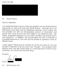 I am writing this letter to let you know how grateful I am for having had the opportunity to meet and work with Randi Shayne. Although all of our interactions have been over the telephone because I live in Florida, she has provided me with an immeasurable amount of information and advice that I have found to be most helpful in my treatment plan. Her holistic, integrated approach to my current condition was exactly what I was looking for. In addition, she has provided me with a multitude of invaluable resources so I can now look for answers to questions I have on different issues.