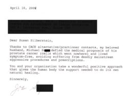 Thanks to CACE alternative/practitioner contacts, my beloved husband, Michael Sage defied the medical prognosis of his prostate cancer (cells which went nowhere) and lived symptom-free, avoiding suffering from deadly mainstream aggressive procedures and prescriptions.