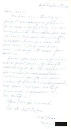 Joe joins me in thanking you for your counseling and guidance to a new way of eating. We are amazed with how much food we can eat and still lose weight. Wherever have you been all our lives? It would have been wonderful to meet you sooner.