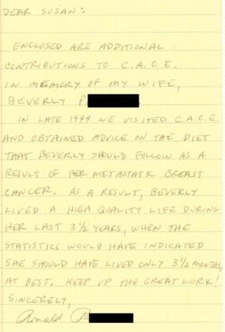 In late 1999 we visited C.A.C.E. and obtained advice on the diet that Beverly should follow as a result of her metastatic breast cancer. As a result, Beverly lived a high quality life during her last 3½ years, when the statistics would have indicated she should have lived only 3½ months, at best. Keep up the great work!
