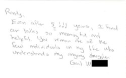 Even after 5!!! years, I find our talks so meaningful and helpful. You remain one of the few individuals in my life who understands my ongoing struggle.