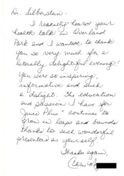 I recently heard your Health talk in Overland Park and I wanted to thank you so very much for a literally delightful evening! You were so inspiring, informative and such a delight. The education and passion I have for Juice Plus+ continues to grow in leaps and bounds thanks to such wonderful presenters as yourself.