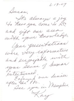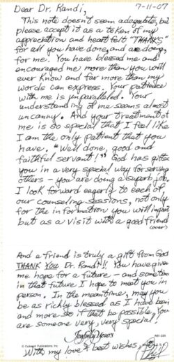 This note doesn’t seem adequate, but please accept it as a token of my appreciation and heartfelt “THANKS” for all you have done and are doing for me. You have blessed me and encouraged me more than you will ever know and far more than my words can express. Your patience with me is unparalleled. Your understanding of me seems almost uncanny. And your treatment of me is so special that I feel like I am the only patient that you have. Well done, good and faithful servant! God has gifted you in a very special way for serving others — you are doing a superb job. I look forward eagerly to each of our counseling sessions, not only for the information you will impart but as a visit with a good friend.