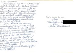 I am sending this additional gift to CACE as a token of our appreciation for the gift of education you gave us last Sat. It was a joy to become acquainted with you & it certainly gave us a greater understanding about the mission of CACE.