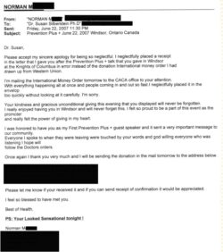 Please accept my sincere apology for being so neglectful. I neglectfully placed a receipt in the letter that I gave you after the Prevention Plus + talk that you gave in Windsor at the Knights of Columbus in error instead of the donation International money order I had drawn up from Western Union.