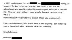 In 1995, my husband, Bruce K., left ... having, as he put it, ‘flunked out’ of said hospital. We turned to you, and the advice/leads you gave him gained him another year and a half of blessed life. We were - and I still am - more grateful than you can ever know. What a tremendous gift you give to your clients! Thank you so very much.