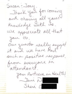 Thank you so much for traveling to Kansas City to share your expertise with our community! We really do appreciate it. Your presentations were wonderful. Great information with a nice mix of humor! I personally want you to know I enjoyed the opportunity to get to know you better over dinner at Bravos. Thank you for the information regarding M.S. I’m anxious to check into your recommendations.