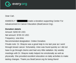 We really appreciate the support we have received and are sending in a $500 membership to support C.A.C.E. and its continued efforts in helping people with cancer.