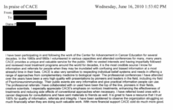 To: ... I have been participating in and following the work of the Center for Advancement in Cancer Education for several decades. In the 1980s and 1990s I volunteered in various capacities and attended conferences for many, many years. CACE provides a unique and valuable service for the public. With no vested interests and having impartially followed and reviewed most treatment programs around the world for decades, it is the most credible source I know for information and referrals for people when they may be inundated with confusing and biased information at a most stressful time in their lives. CACE is also very sensitive to respecting individual belief systems and needs in offering a range of approaches from complementary medicine to biological repair. The professional conferences I have attended over the years have been of a very high quality with presentations by pioneers and leaders in the field, including my field of Psychoimmunoneurology. Their public events are very informative and give practical information people can use. The professional referrals I have collaborated with or used have been the top of the line, pioneers in their fields, creative scientists. I especially appreciate CACE’s emphasis on nontoxic treatments, enhancing the effectiveness of treatments and reducing side effects of conventional approaches when necessary. I have referred loved ones with a cancer diagnosis for consultations and have sent materials to friends as well. It is great to have a resource that I trust 100% for quality of information, referrals and integrity. I have been saddened to observe the organization struggling so much financially when they are doing such valuable work. With more financial support CACE cold do much more good.