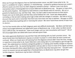 The first few months after my Dad’s diagnosis were very difficult emotionally. My Mom and Dad were always encouraged whenever we talked with Susan at BeatCancer.org. In fact, when my Mom would have a difficult day, she would ask, “How much longer until our next consultation with Susan?” We all felt encouraged when we talked with Susan and were given hope.