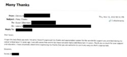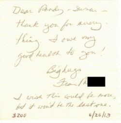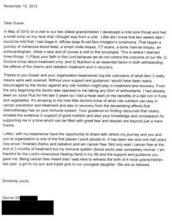 I hope this note finds you well. I’m sorry I haven’t expressed my thanks and appreciation sooner for the wonderful support you provided during my cancer ordeal now 2 ½ years ago. I am still cancer free and in fact have not even had a cold these last 2 ½ years. Thank you so much for your support and education. I have attached a short letter expressing my thanks that you are welcome to use in any way you feel is appropriate.
