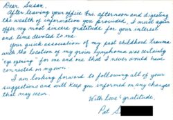 Your quick association of my past childhood trauma with the location of my groin lymphoma was certainly “eye opening” for me and one that I never would have connected on my own.
