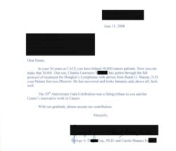 In your 30 years at CACE you have helped 30,000 cancer patients. Now you can make that 30,001. Our son, Charles Lawrence S, has gotten through the full protocol of treatment for Hodgkin’s Lymphoma with advice from Randi G. Shayne, N.D., your Patient Services Director. He has recovered and looks fantastic and, above all, feels well.