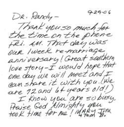 Thank you so much for the time on the phone Fri. a.m. That day was our 1 week re-marriage anniversary! Great southern love story – I would hope that one day we will meet and I can share it with you. (We are 72 and 64 years old!)