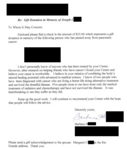 I don’t personally know of anyone who has been treated by your Center. However, after research on helping friends who have cancer I found your Center and believe your cause is worthwhile. I believe in your mission of combining the body’s natural healing potential with advanced in medical science. I know of two people who have been diagnosed with cancer who are living a better life doing alternative treatment and survived the dreadful disease. Five people close to me have done only the medical treatment of radiation and chemotherapy and have not survived the disease. It was heartbreaking to see they suffer as they did.