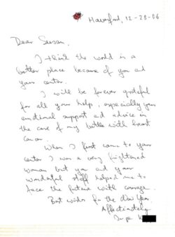 When I first came to your center I was a very frightened woman but you and your wonderful staff helped me to face the future with courage.